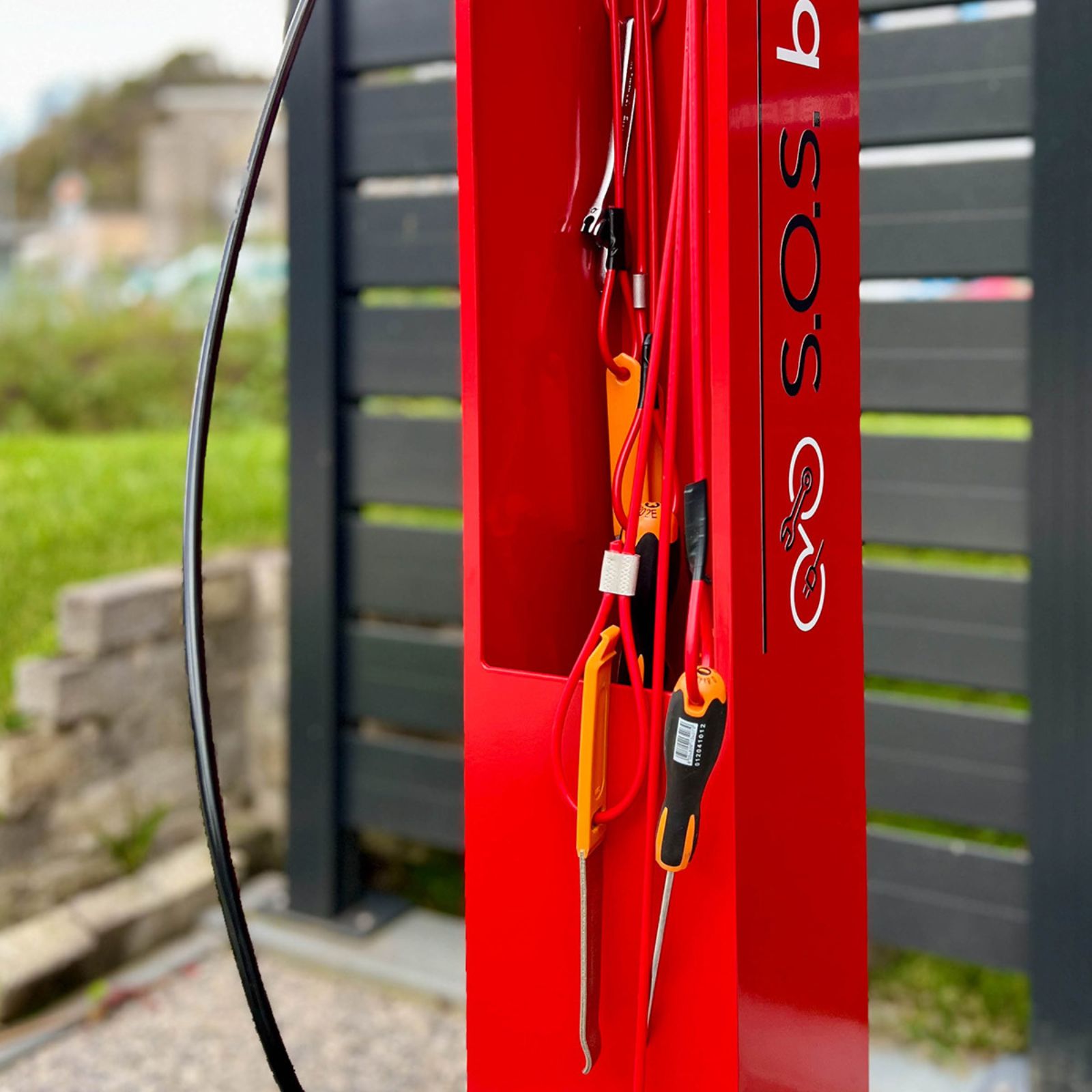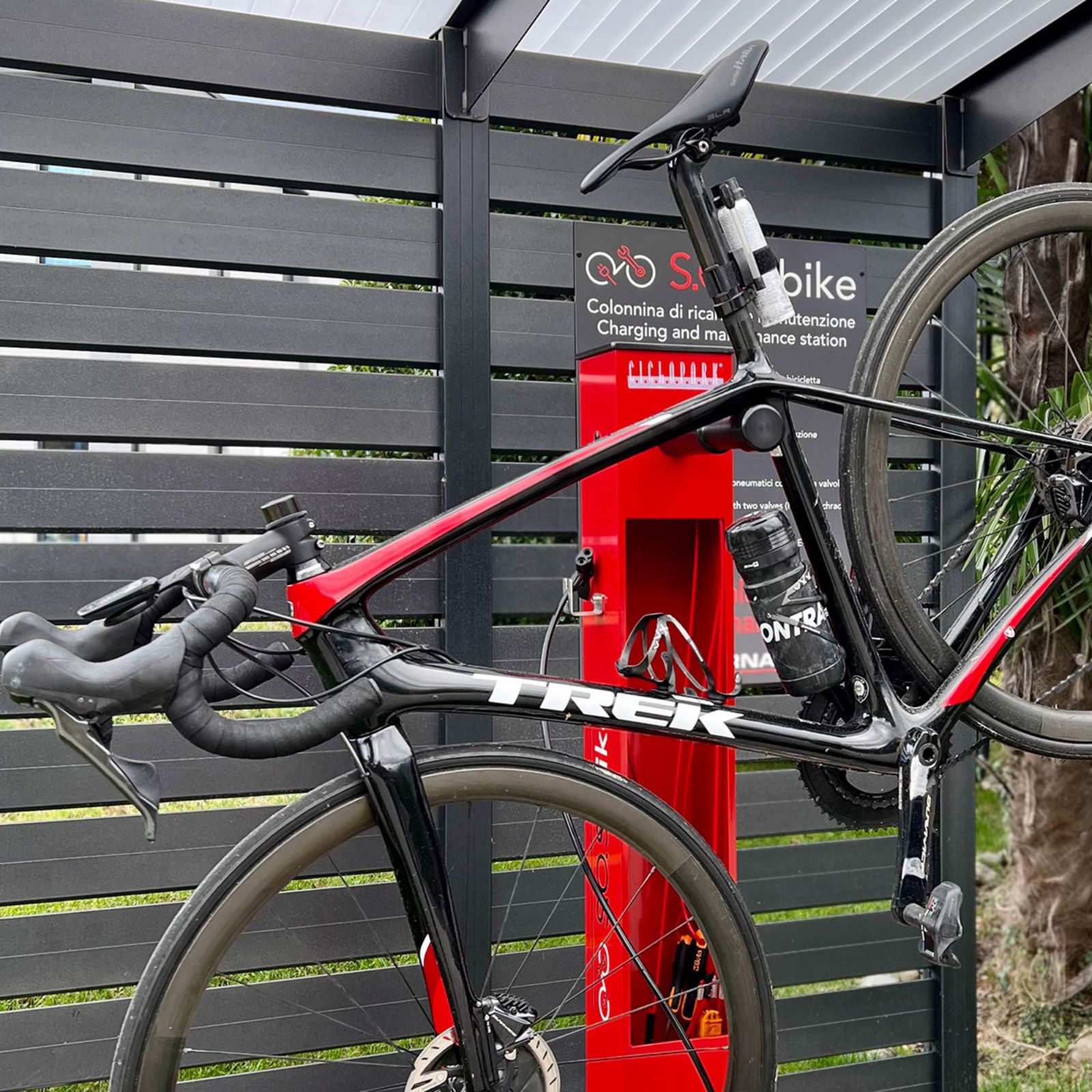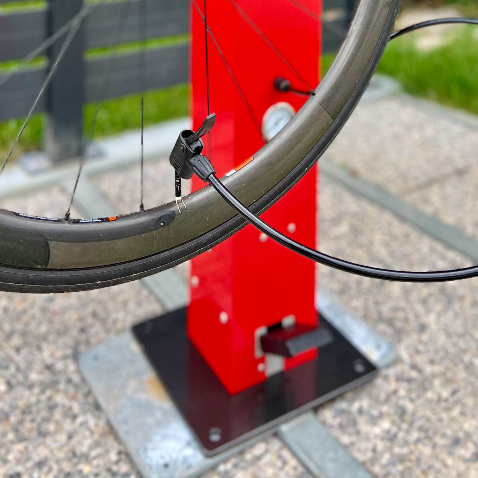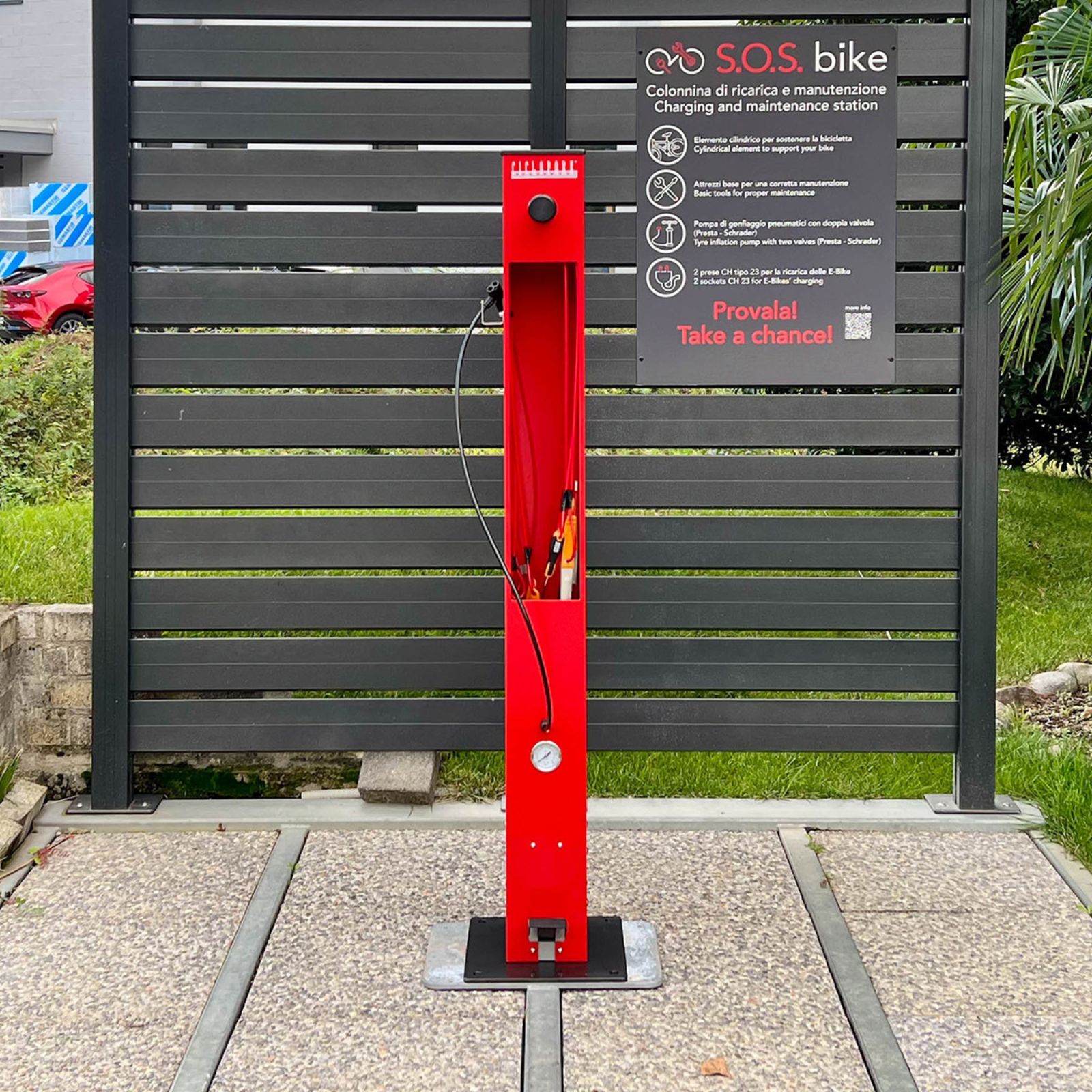 Stazione manutenzione bici con pompa gonfiaggio, ideale per ciclopiste e aree pubbliche.