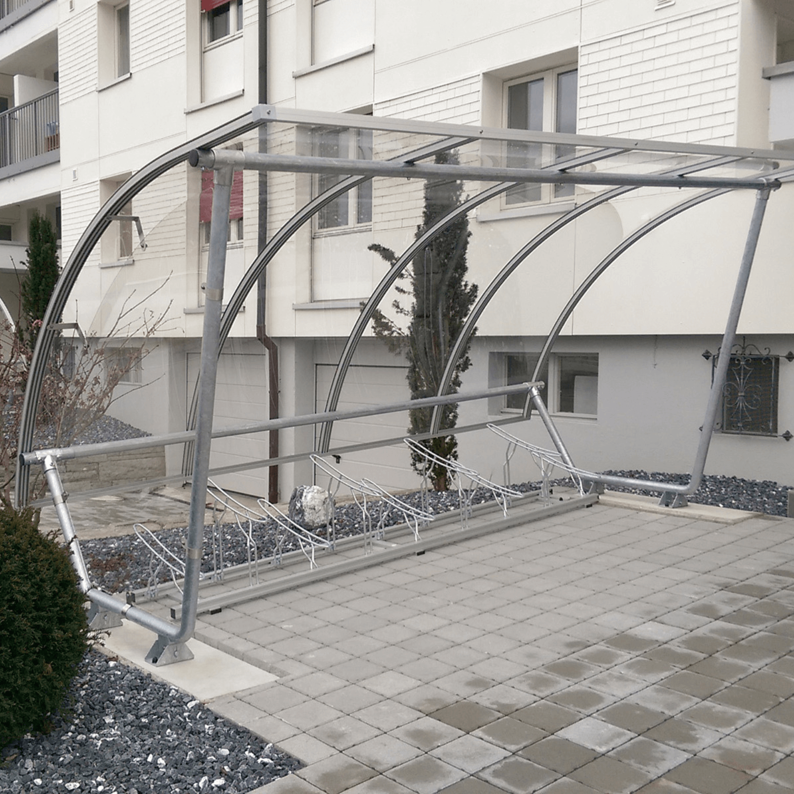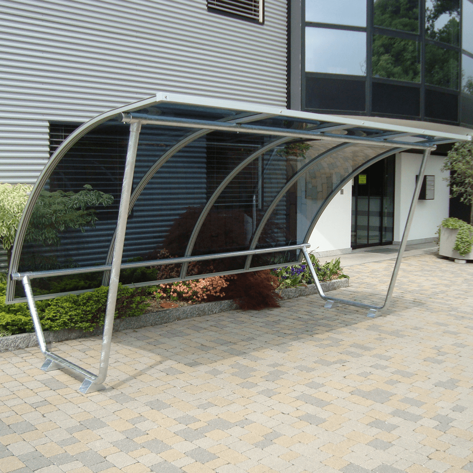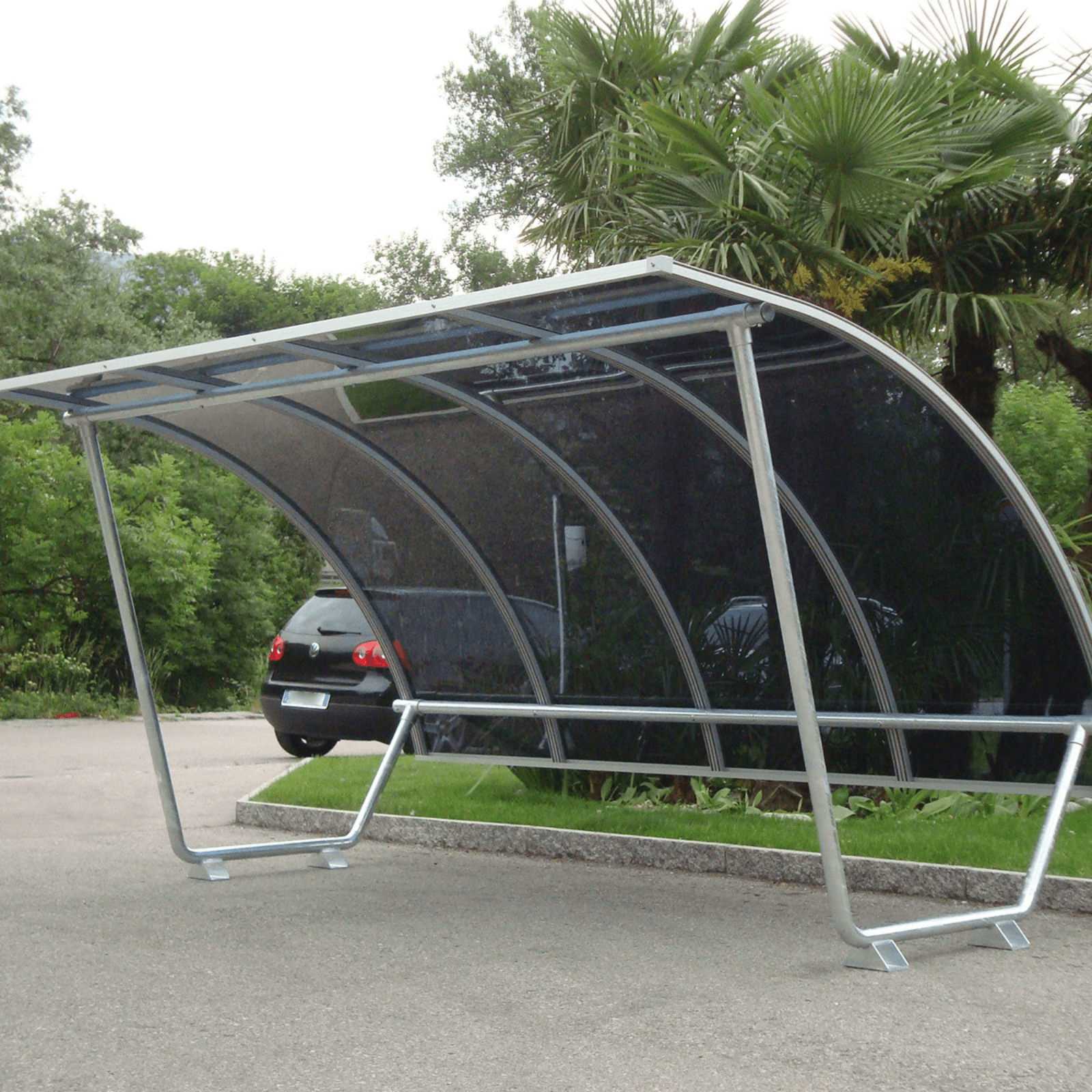 Pensilina elegante con struttura tubolare ideale per biciclette e motocicli.