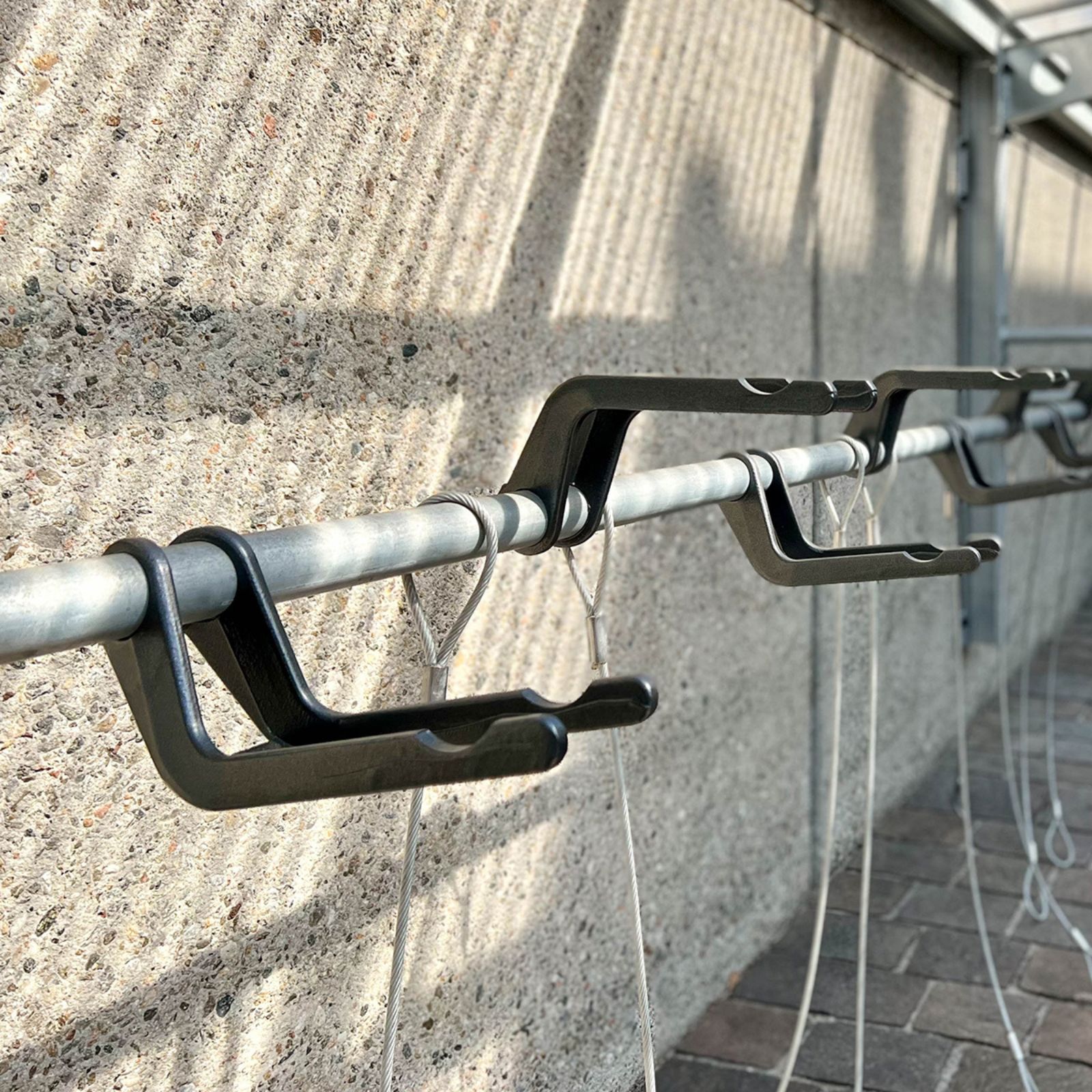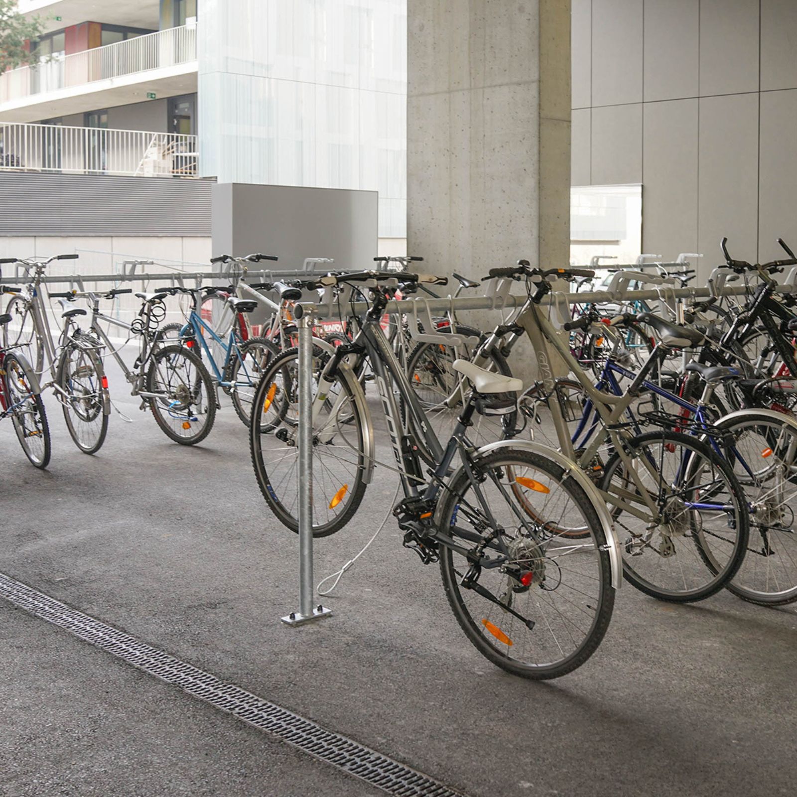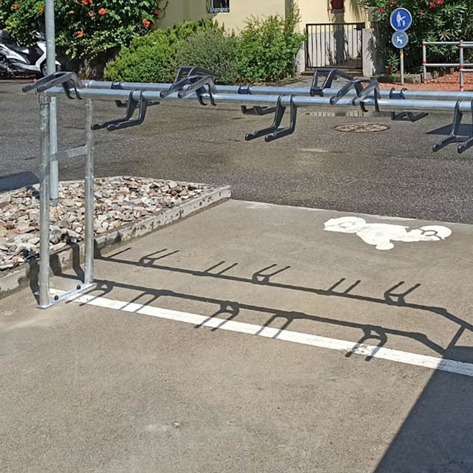 Rastrelliere pratiche con supporto per manubrio, ideali per fissaggio a muro o su paletti.